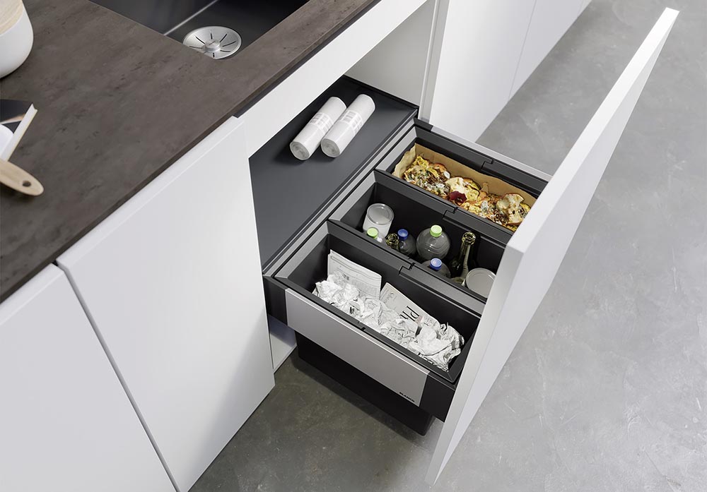 Blanco Select II waste mechanisms are designed for installation in a sink cabinet. Select includes the sliding mechanisms, the waste pull-out with its bins, and a top cover that also functions as a shelf.