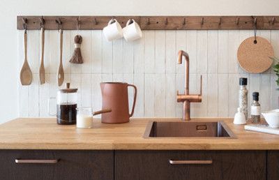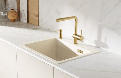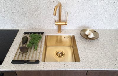 Loisteliaat harjattu kulta- ja kuparikeittiöaltaat sopivat kauniisti yhteen trendikkäiden keraamisten- ja kivitasojen kanssa. Tyylikäs kokonaisuus viimeistellään värillisen keittiöaltaalla ja hanalla.