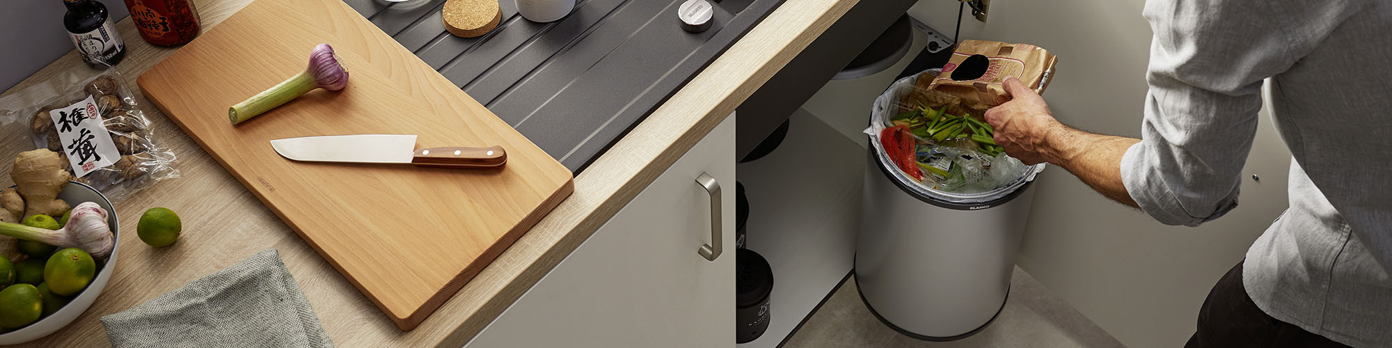 Blanco Singolo monteras i dörren och skåpets ram. Då man öppnar skåpsdörren öppnas också avfallshinkens lock, vilket gör att avfallshinken kan användas utan hinder. Singolo är en enkel och smidig avfallsmekanism, särskilt för mindre kök, eftersom Singolo kan installeras i skåp som är minst 45 cm breda.