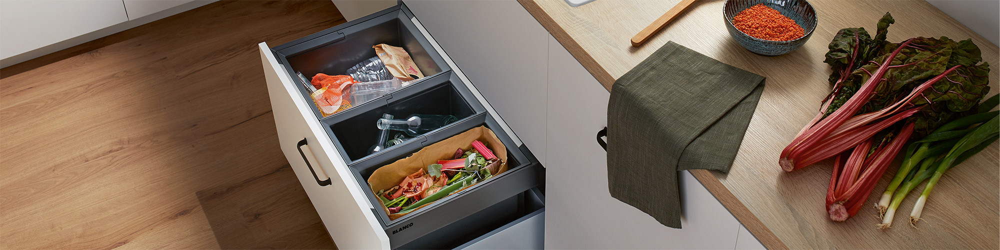 Blanco Flexon är den rätta lösningen om du söker efter ett särskilt lättinstallerad sopsortering för skåpslådor. Blanco Flexon, som installeras med bara sex skruvar, fästs på botten av den befintliga lådan samt på den dörr som är kopplad till den. Sopsorteringen finns tillgänglig med hinkar i flera olika storlekar, och dess ergonomiska och stiliga design gör Flexon till ett praktiskt sorteringscenter.